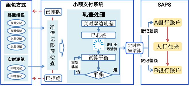 到了指定清算场次,小额系统会在提交SAPS记账前,把这个场次所有的支付请求通过“试算平衡”重新算一遍。确保所有清算交易被正确处理,然后提交给SAPS完成记账处理。