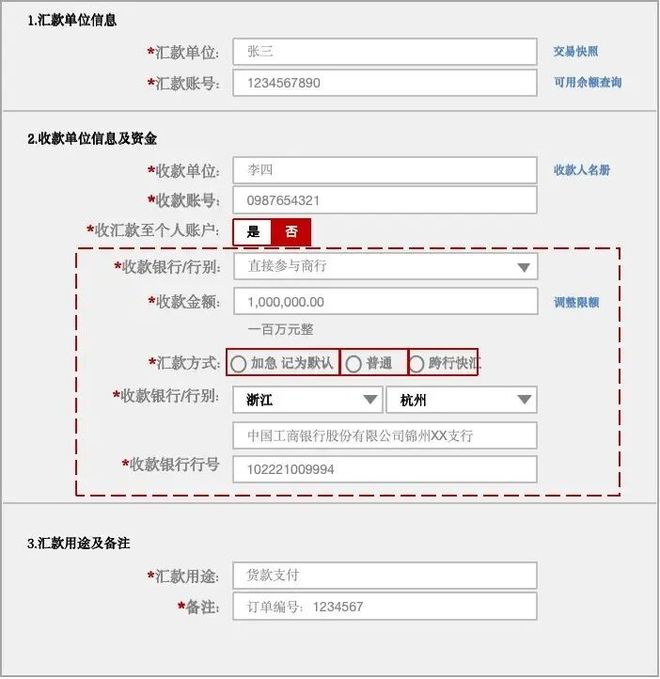 汇兑业务是最为常用的的业务了,它可以提供给网银、银企直联等系统进行跨行汇款。也可以在柜面填写汇款单进行汇款。从下图的网银汇款界面可以看到,它支持大额、小额和超网的普通贷记,用户可自由选择付款方式。