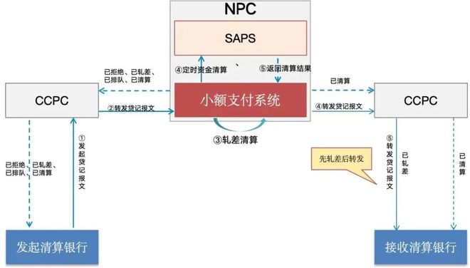 普通贷记和大额汇款都是先轧差后转发,轧差后的报文可作为付款依据,收款行需先接收。小额资金清算是定时进行的,轧差报文经SAPS清算后,小额系统会通知银行清算结果。