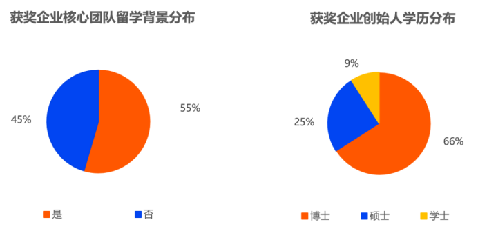 团队背景:24家获奖企业核心团队有留学背景;超九成企业创始人拥有硕士及以上学位,其中近七成拥有博士学位;毕业学校方面,有6位企业创始人毕业于清华大学、5位毕业于复旦大学,毕业于北京大学、上海交通大学和浙江大学分别有2位。复合背景的人才结构是早期硬科技企业的核心竞争优势。